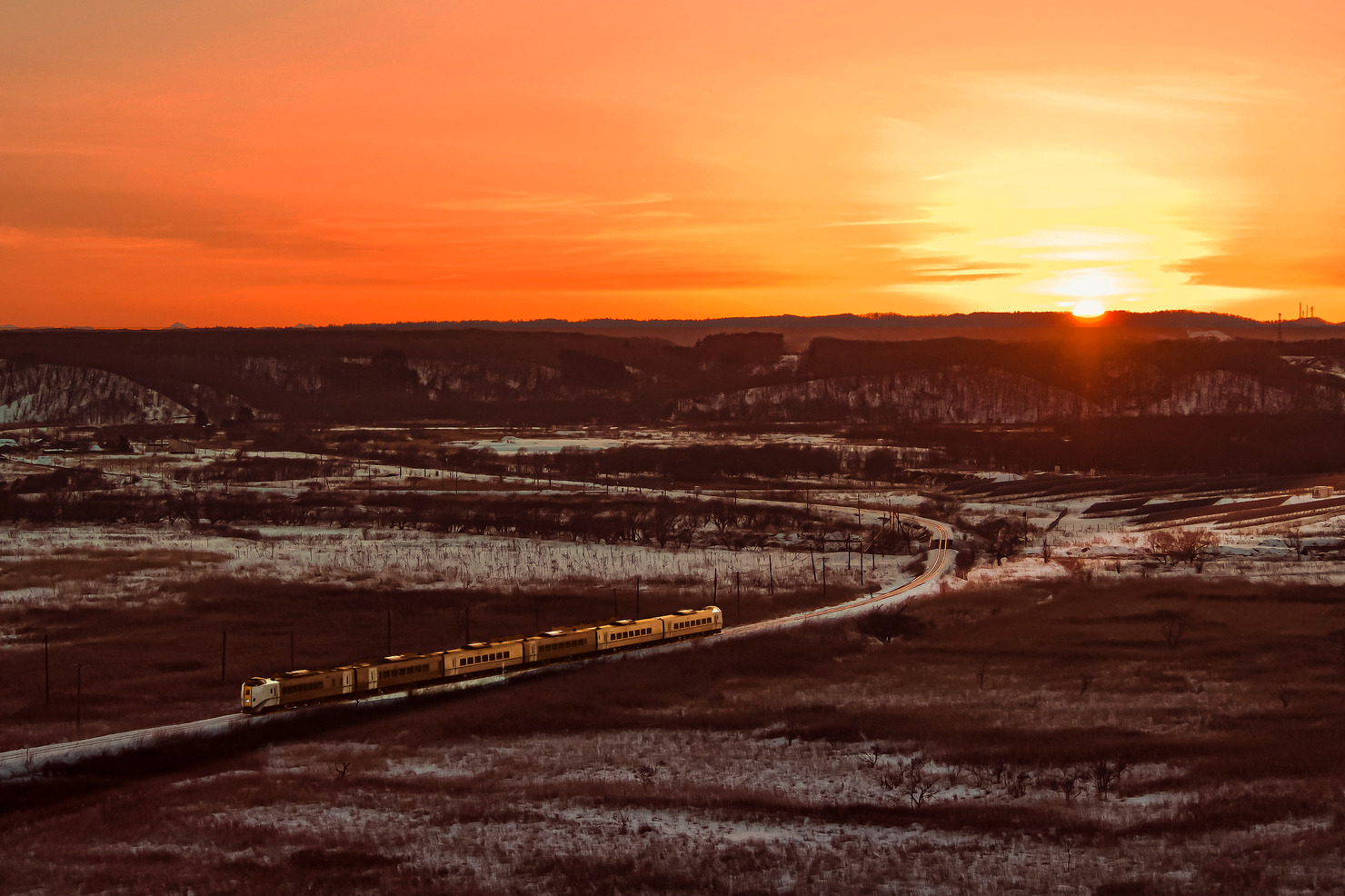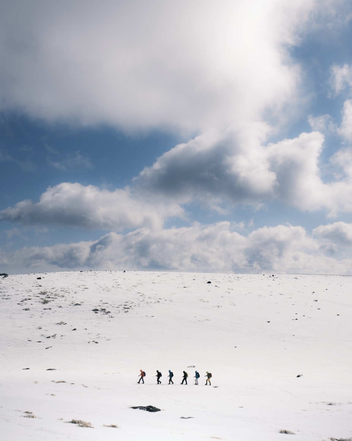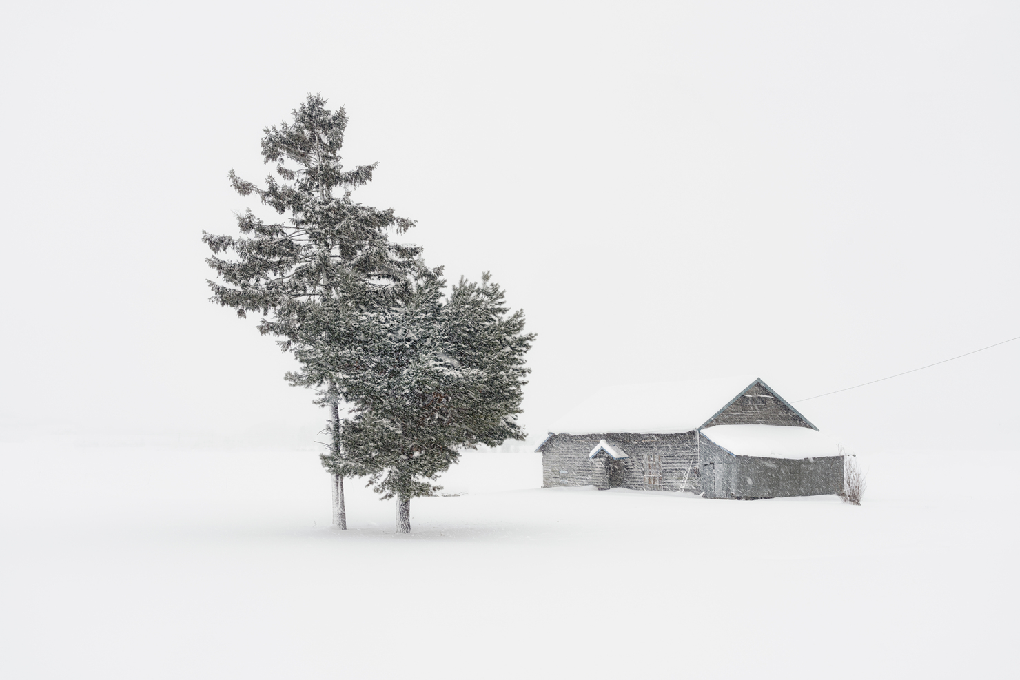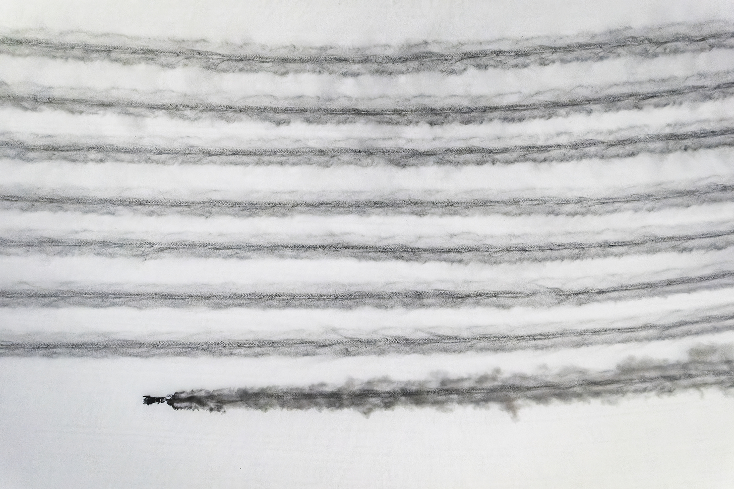 北海道の美瑛町では3月になるとスノーモービルで融雪剤(灰のようなもの)を撒き始めます。既視感のない絵作りをしたくドローンで真上から撮影しました。また真っ白な雪面に撒かれる灰を水墨画に見立て、白黒の濃淡を意識しながらレタッチしました。