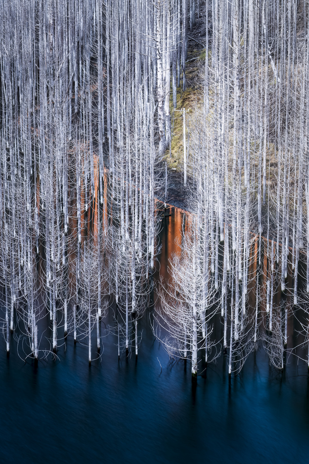 秋深まるダム湖、佇む枯木の中に電信柱。何処となく寂しさを感じましたが、今も尚、立つその姿に感銘を受け力強い色合いにし、電信柱に目が行く様に明るめに仕上げてみました。
