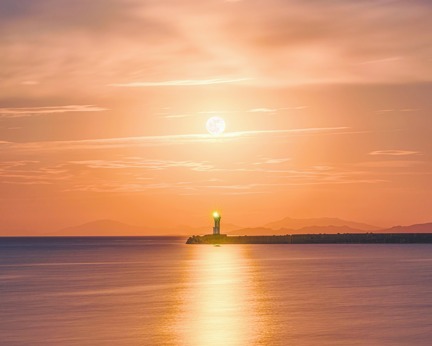 レタッチの考え:月は短時間露光、灯台と港は長時間露光で最後合成。月上り時は黄色のため、月、そして海や遠い山も黄色を強化しました。テーマ:長崎には灯台が多く、そして日か月かと重ねて撮れるのも多いです。それを撮り巡ってみたいと思います。