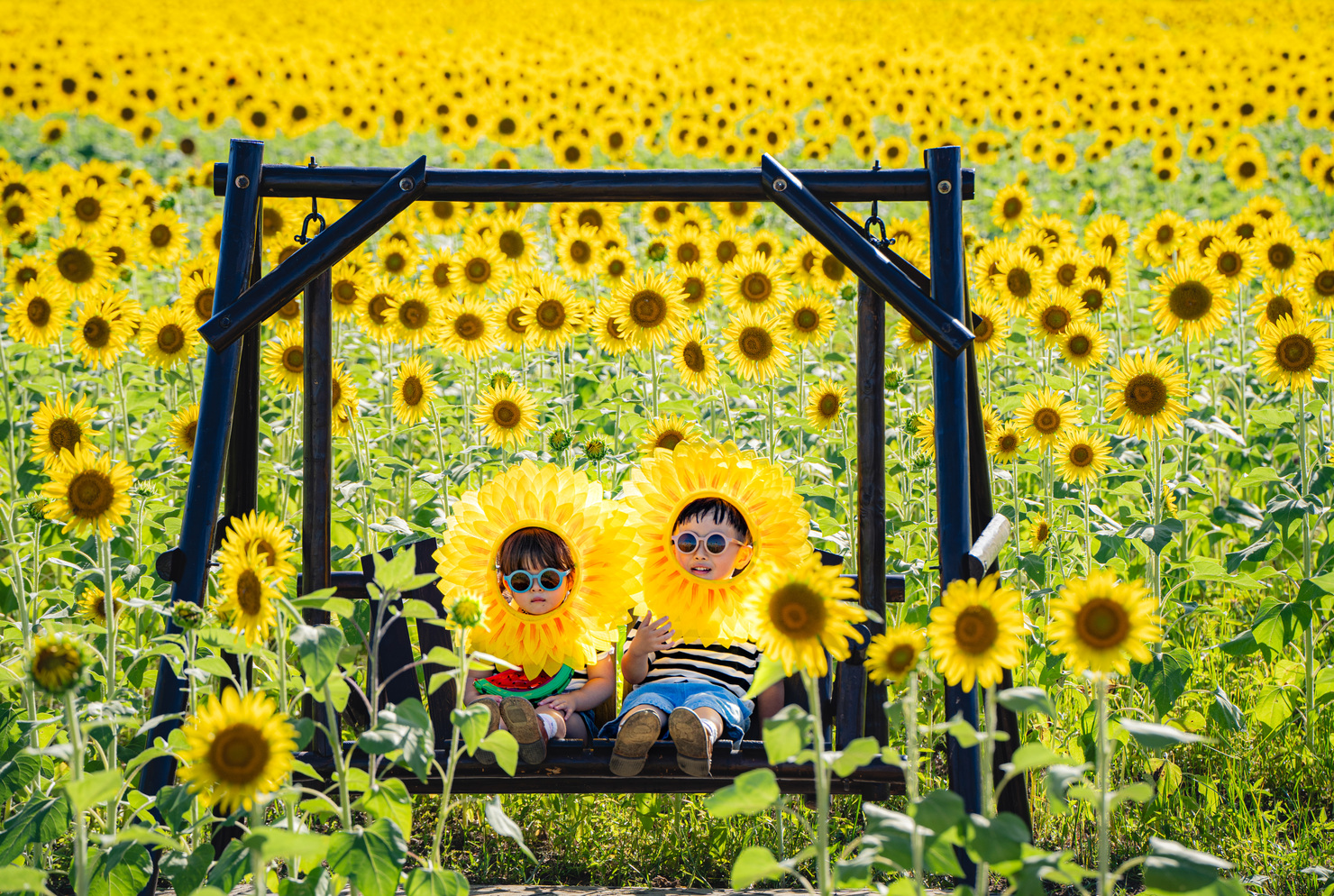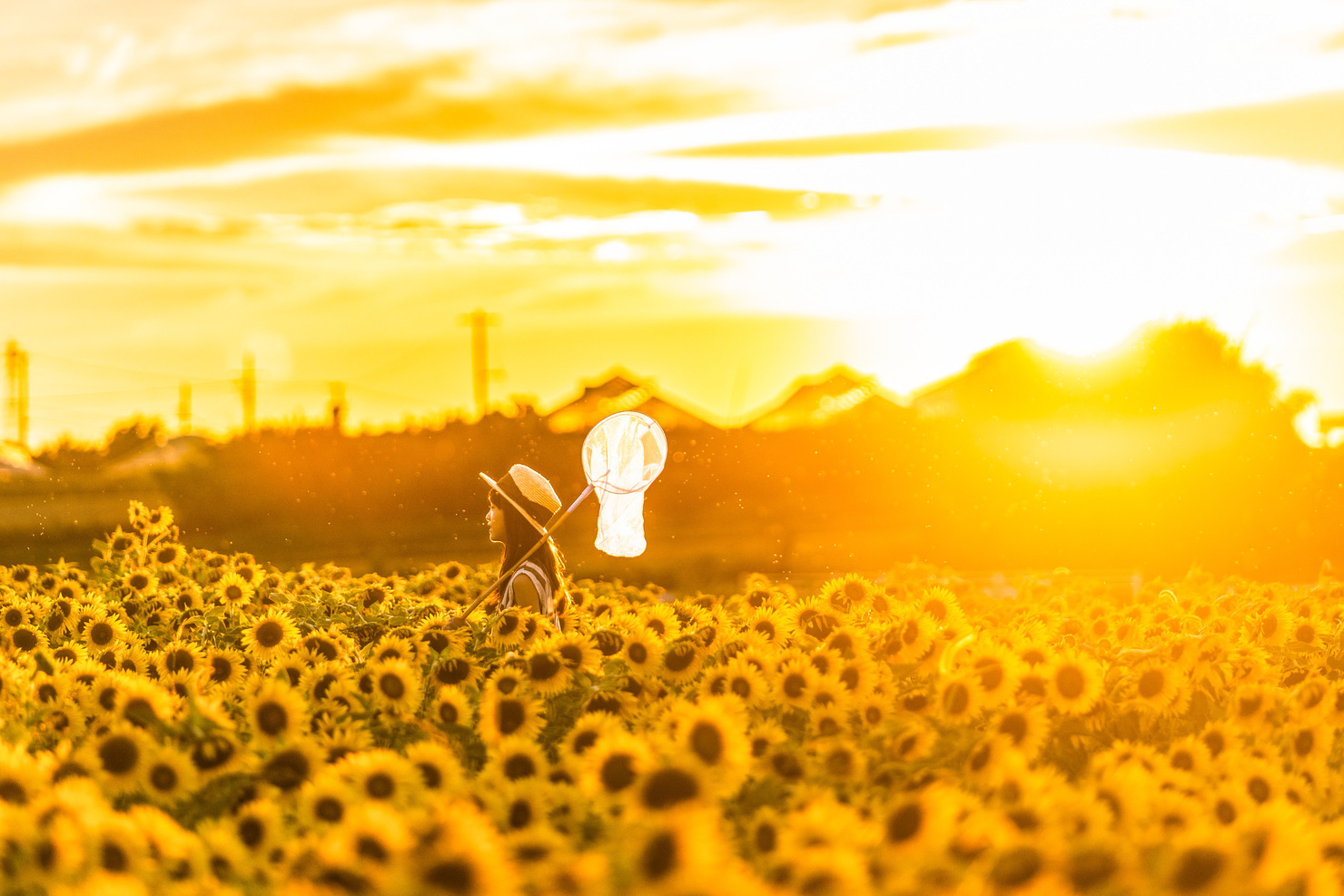 夕焼けに照らされたひまわりがとても綺麗で、目で見た光景を写真に残したいと思いました。レタッチは、光り輝くひまわり、ひまわり畑に立つ娘がそれぞれ引き立つように意識しました。