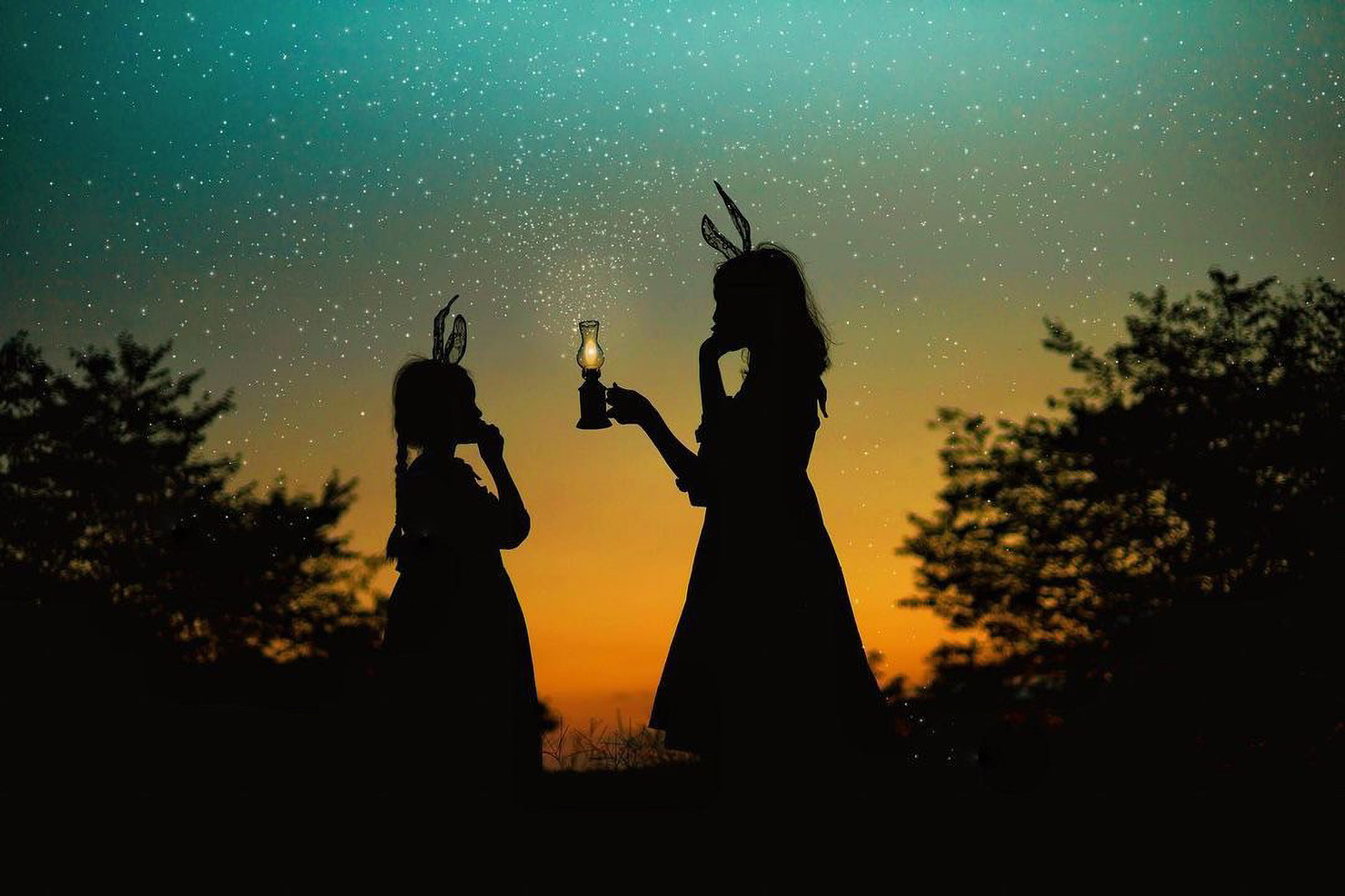 夏の終わりに月に住んでいるうさぎちゃんたちがこっそり深夜地球に降りて団子を食べているシーンで、お星様がランタンから出てきて空を明るく照らすイメージ。夕方の撮影で深夜に見えるよう空の色を工夫してお星様により夢や非現実的な世界を表現してみた。