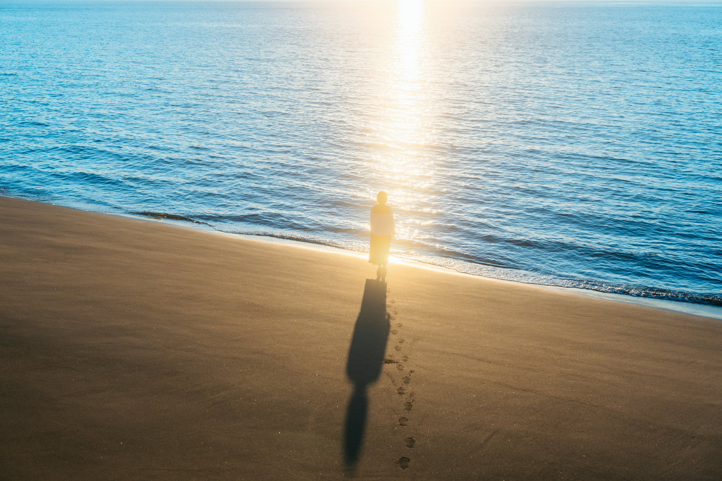 日が暮れてきて1日が終わる。1日は終わったけど、また明日へと続く道を海と夕陽の光でイメージしてみました。光、人物の影、海の色など写っているものが少ないので色味やコントラストを意識してレタッチをしました。