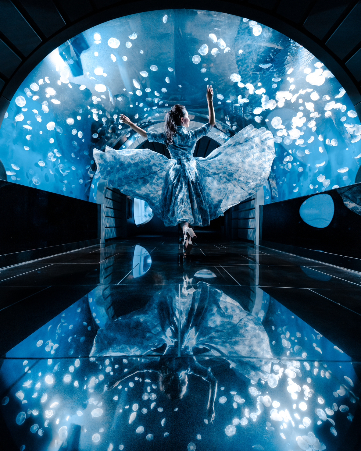 浮遊するクラゲや展示空間を見て宇宙船の中にいるような感覚になりました。そのため宇宙をテーマにレタッチをしました。クラゲを星に見立てて光り輝くような印象になるよう意識し宇宙にいるかのようにドラマチックに仕上げました。