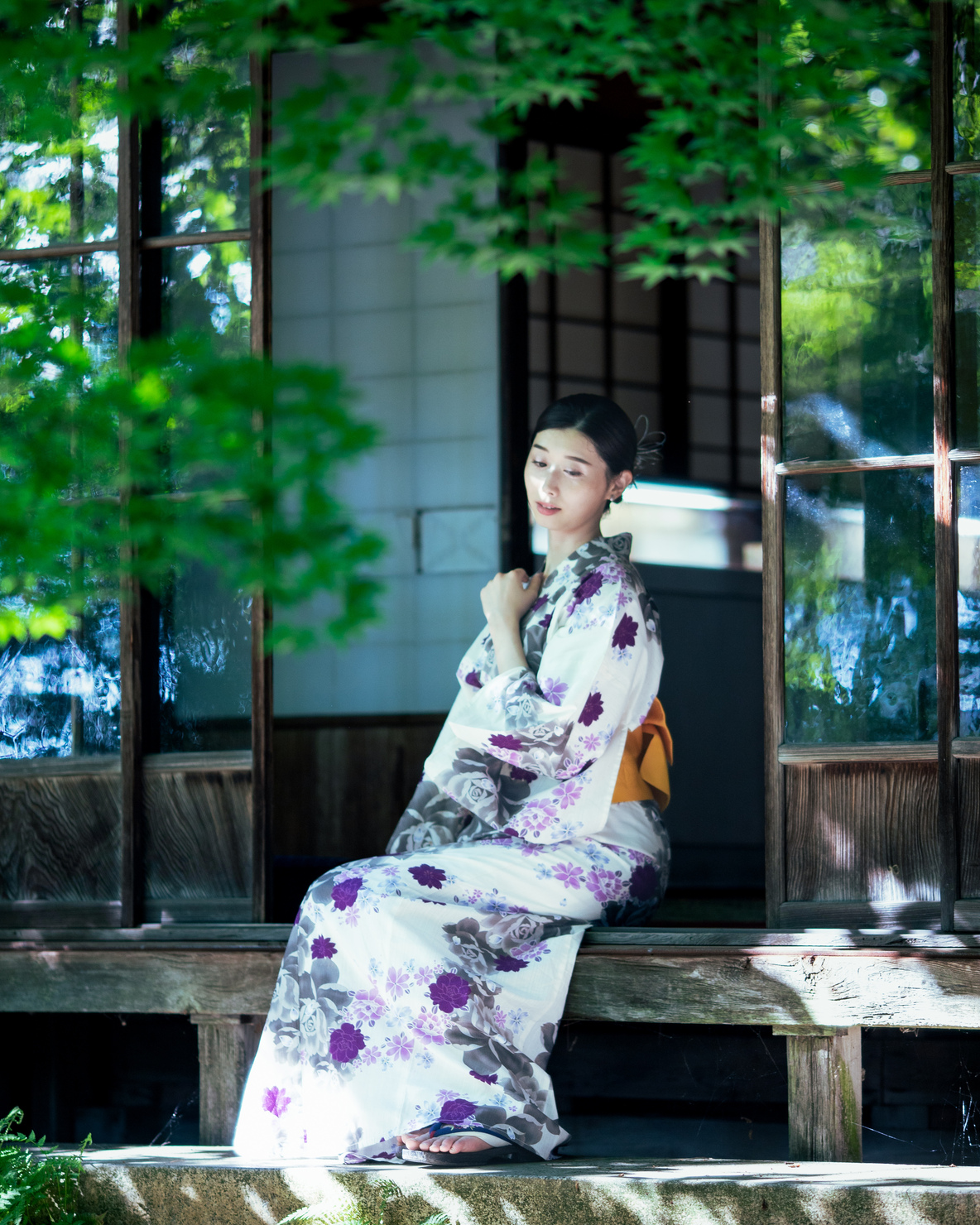 梅雨明け直後の真夏日の撮影でした。古民家の大正ガラスに映り込む青い楓が美しくなるように意識しました。またシャドウ部分に青味を含ませる事で白い浴衣がより涼やかな印象になるように仕上げました。