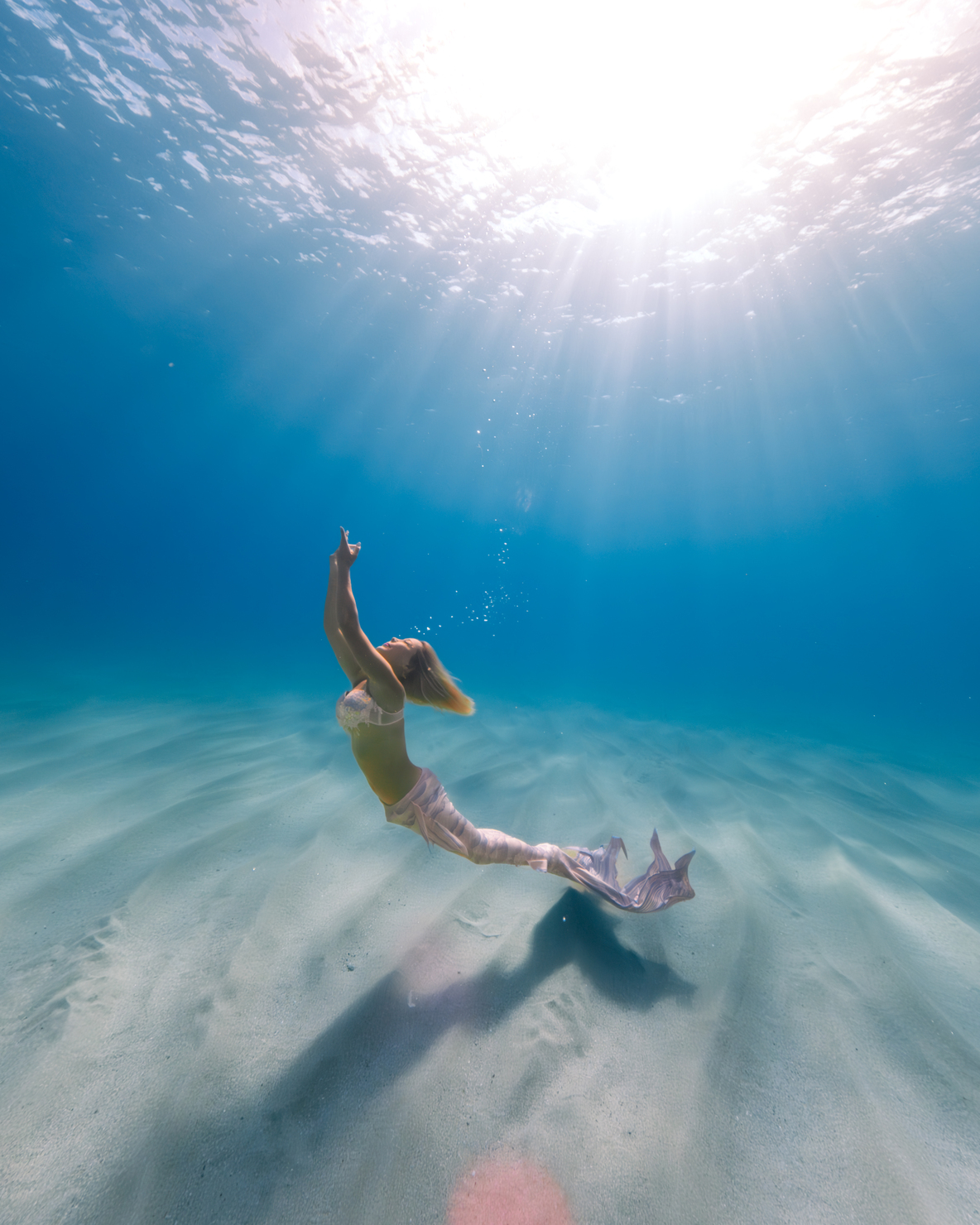 水中写真独特の青被りを綺麗に除去すること、自然だけど印象的な太陽光を意識してレタッチしました。美しい海の中に住みながらも人間の世界へ憧れる人魚をイメージしました。