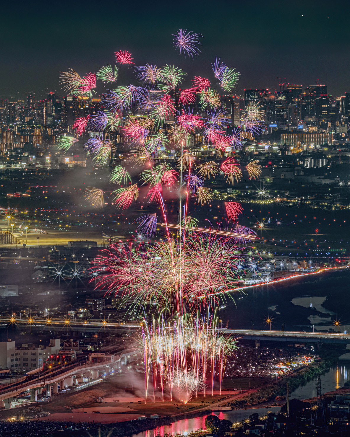 会場に集まるたくさんの人達の様子と艶やかな彩色千輪菊が開いてる時の花火、そして空港に停まってる飛行機や大阪のビル街の様子が分かるようにレタッチしました