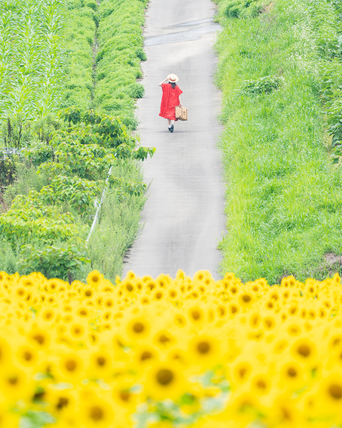 とても不思議な空間であったので、その雰囲気を壊さないよう意識しレタッチしました。ワンピースとひまわりは大切なポイントなので色がはっきりと出るように仕上げました。娘が未来っぽい!と話していたので作品のタイトルに入れました。