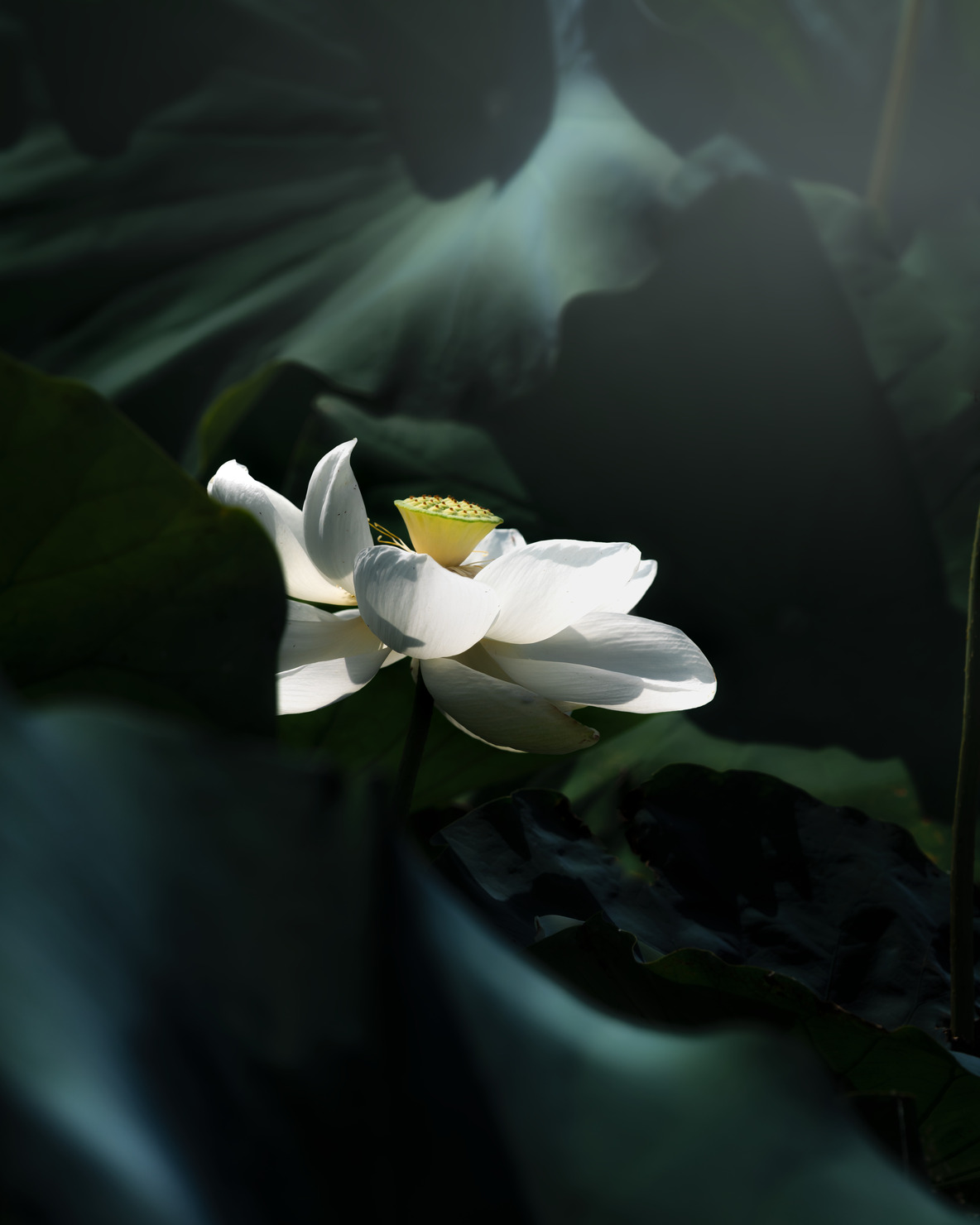 実は晴れた夏場の屋外で撮影した写真です。蓮の白と光を強調するため、蓮以外の光量と彩度を調節するとともに、光と影の明暗差を意識してレタッチしました。また、葉の表面も適度にテクスチャや明瞭度の値を下げ、質感にもこだわりました。