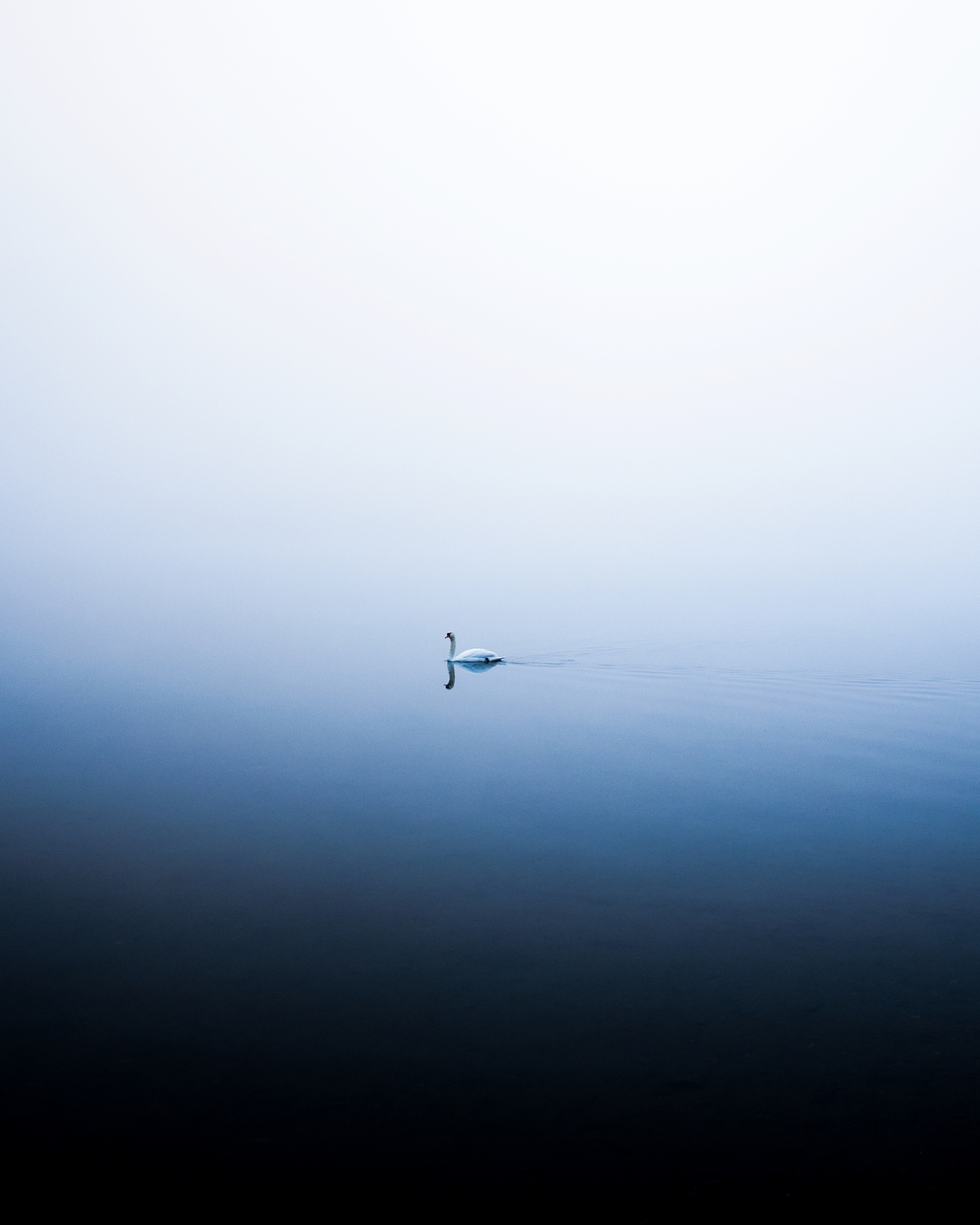 濃霧の精進湖で富士山が出てくるのを待ってたら1羽の白鳥がやってきたので撮影しました。白黒で立体感のある絵を作りたかったので、コントラストをあげ、部分補正を使い手前は暗く奥にいくにつれて明るくなるようレタッチしました。
