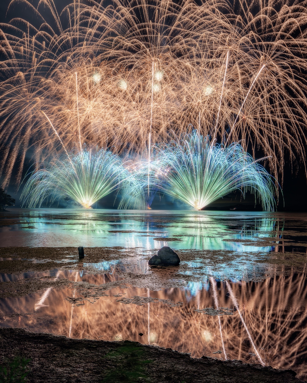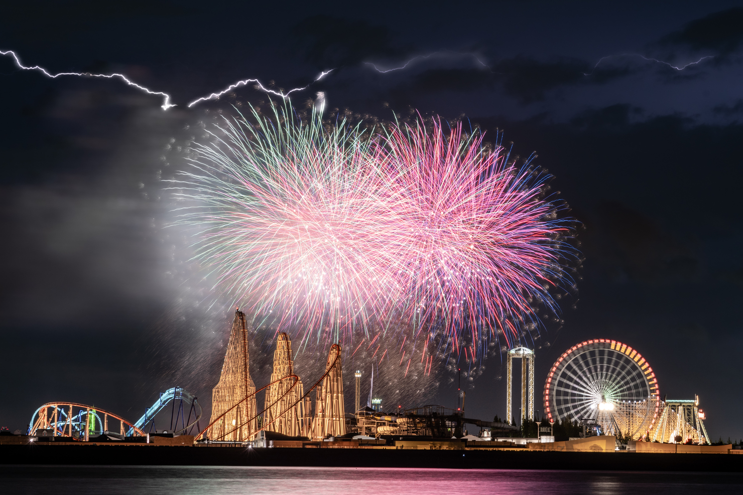 水面のリフレクション、遊園地の真上に打ち上がるバランスの良い花火、そして空の余白を埋めるかのように横走りする稲妻。全てが気持ち良いくらい美しく組み合わさっていて感動しました!おめでとうございます!