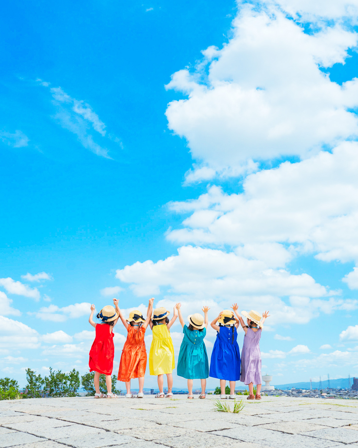 にじいろの子ども達が青空と夏雲に映えるよう意識してレタッチをしました。カラフルなワンピースや青空の彩度をあげ、夏の爽やかさを意識しました。見てもらう人に、子ども達の元気さや、はつらつさが伝われば嬉しいです。