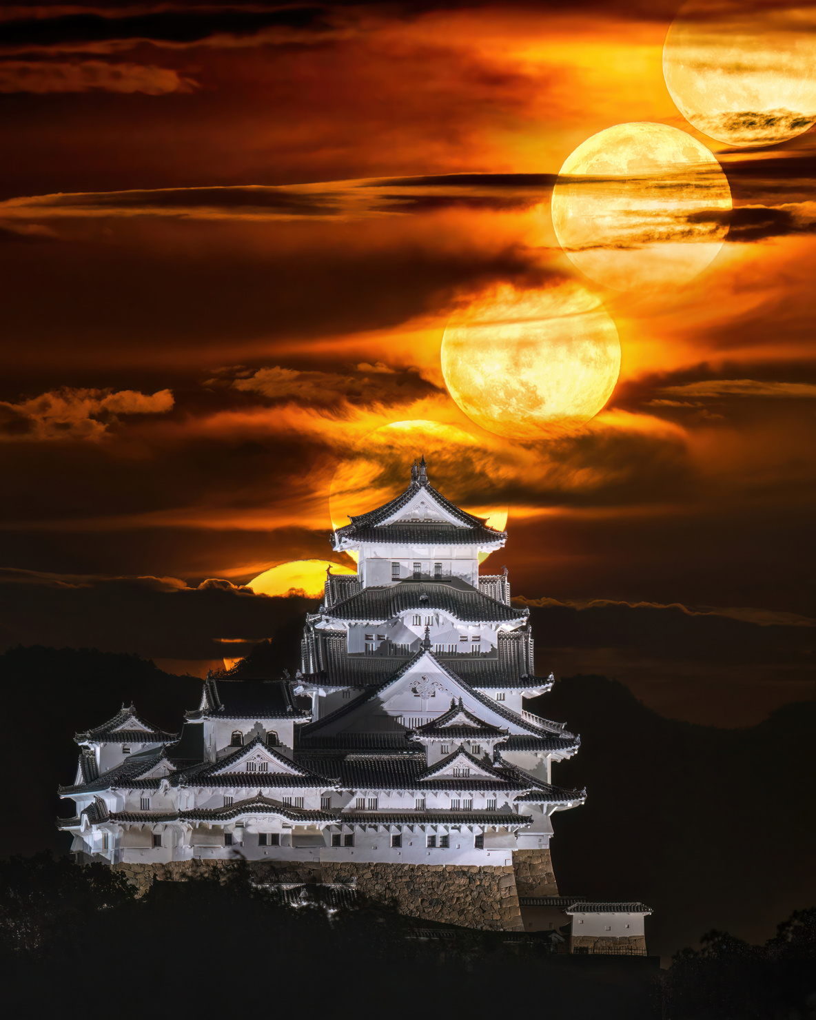 月の軌道を構図固定で撮って部分合成しました。雲の中から現れた満月が姫路城の天守閣と重なるように計算して三脚固定で撮り合成できたのがこだわりのポイントです。満月が雲に隠れたり出たりしているのも風情があってより印象的に仕上げることができました。