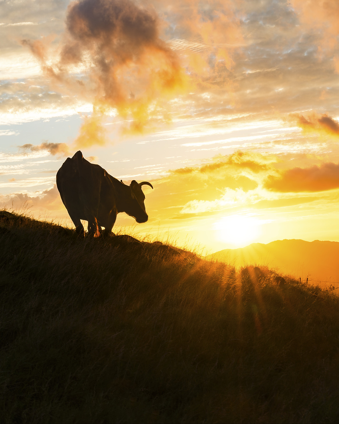 四国カルストの壮大な風景を撮影する為に訪れた夕暮れ時の四国カルスト、夕焼けに放牧された牛達がとても素敵な光景となり夢中で撮影を行いました。レタッチで意識したのは夕暮れの空の彩度を上げ過ぎず実際に見た光景を出来るだけ忠実に再現することでした。