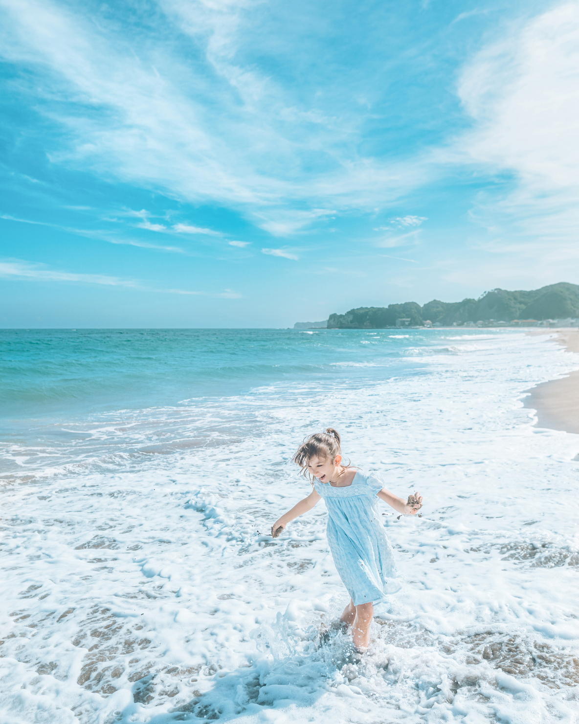 空と海の色味をマスクやカラーミキサーで鮮やかにし、洋服の水色もより目立つようにブラシで強調しています。被写体の子が好きな水色を意識して仕上げました。