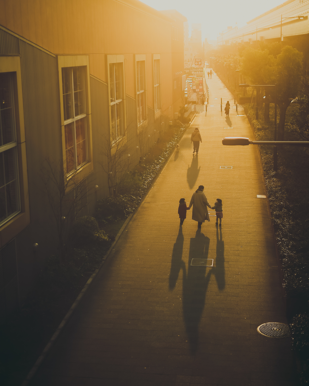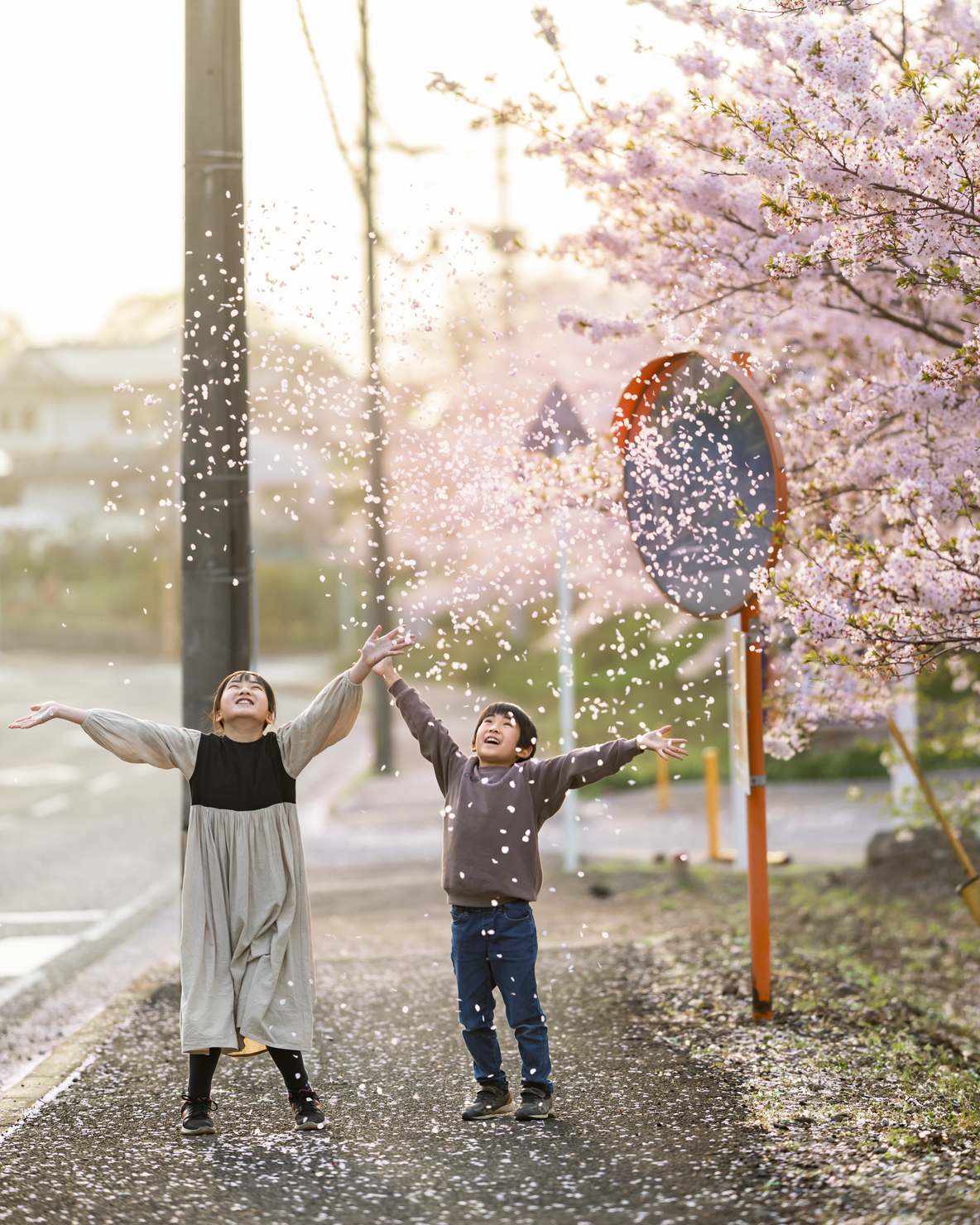 散ったばかりの花びらが道端にあふれていたので、子ども達が一番楽しめる方法を考え撮影をしました。夕日が霞んでいた日だったのでレタッチを暖かみある色合いにすることと、花びらのピンクを強調させることで存在感を出すことを意識しました。