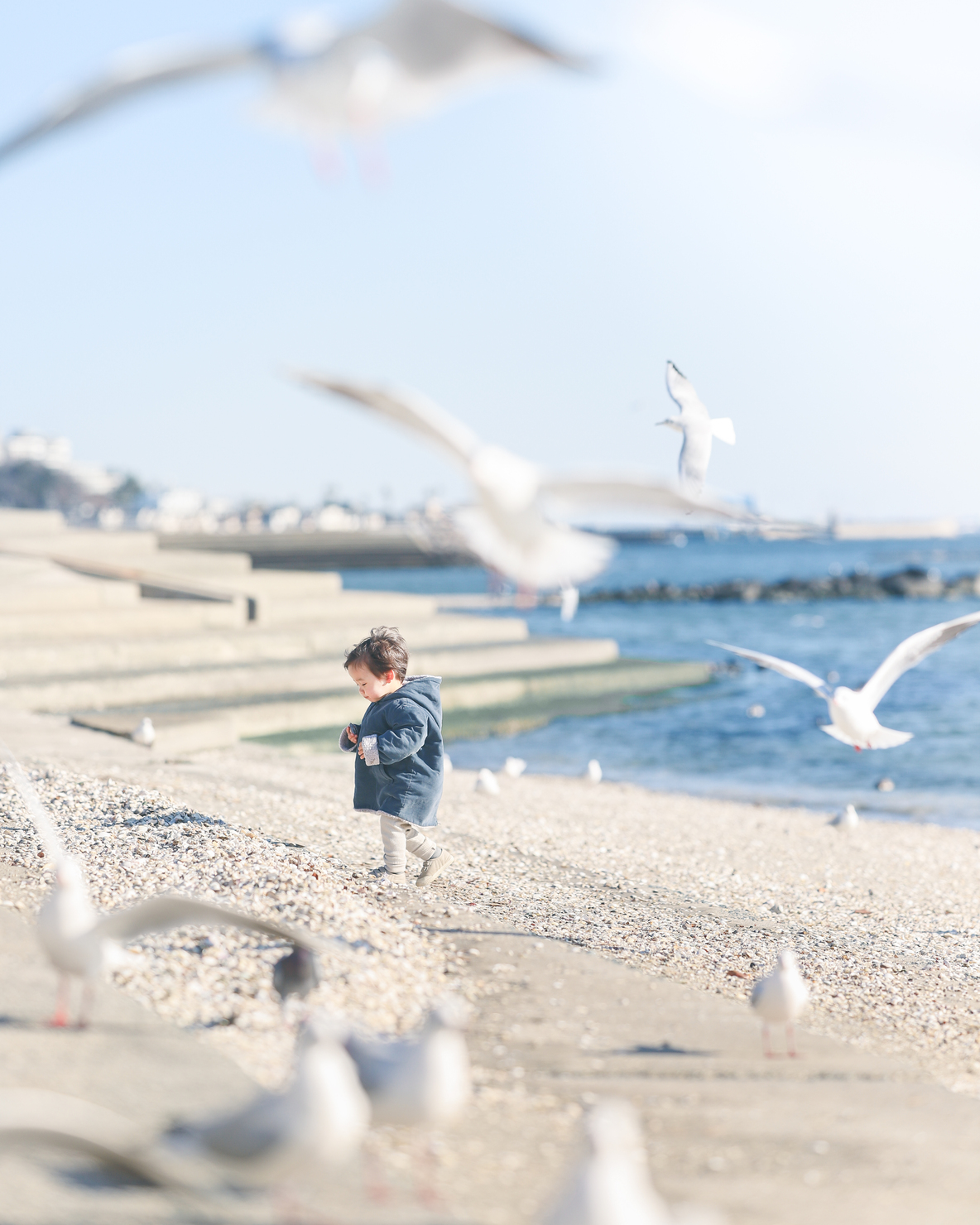 カモメよりも貝殻拾いに夢中だった息子。手前をカモメの大群が飛び立ち、ファインダー越しだと一緒にお散歩しているように見えてシャッターを切りました。優しく包まれている雰囲気にしたいと思い、空の青、海の青、カモメの白さを淡い色味で表現しました。