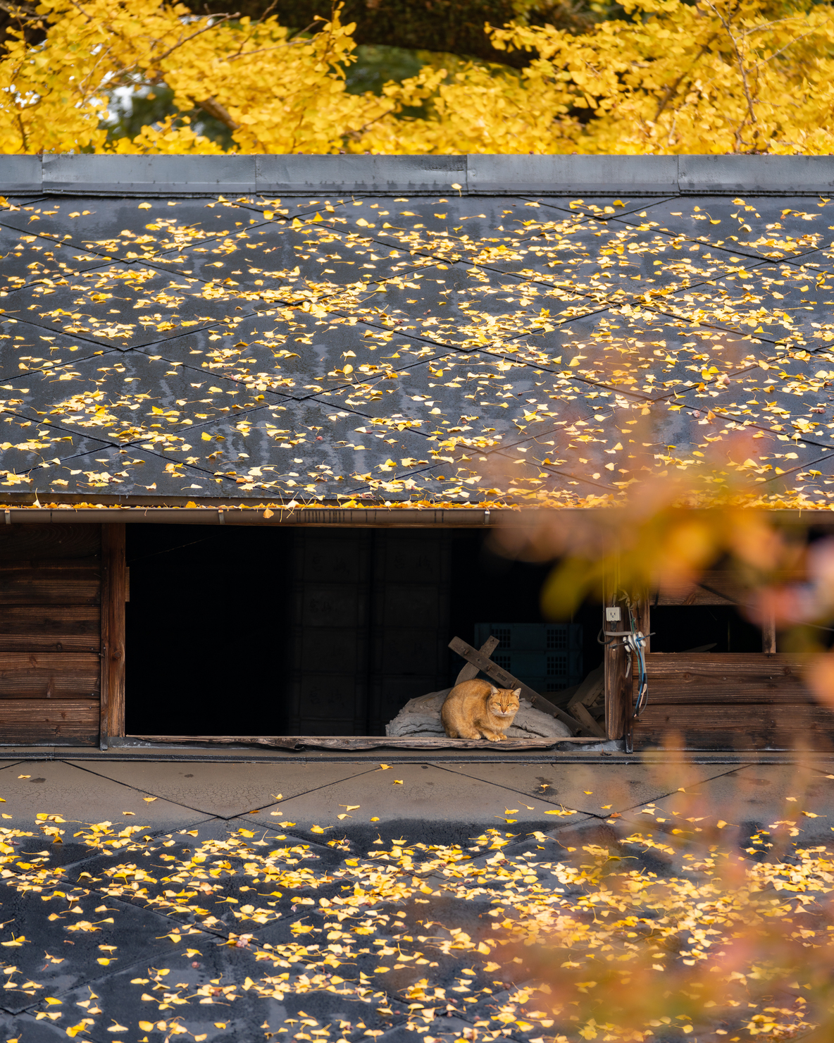 ひっそりと佇む猫と綺麗なイチョウの葉、散歩中に見つけた一コマのような作品に感じます。
